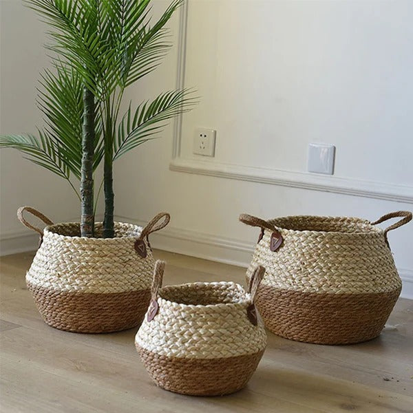 Organize your home in style with these beautifully crafted Handwoven Storage Baskets with Handles. Made from durable natural fibers, these baskets offer the perfect combination of functionality and aesthetic appeal. Their elegant two-tone woven design adds warmth and texture to any room while keeping your space neat and clutter-free.