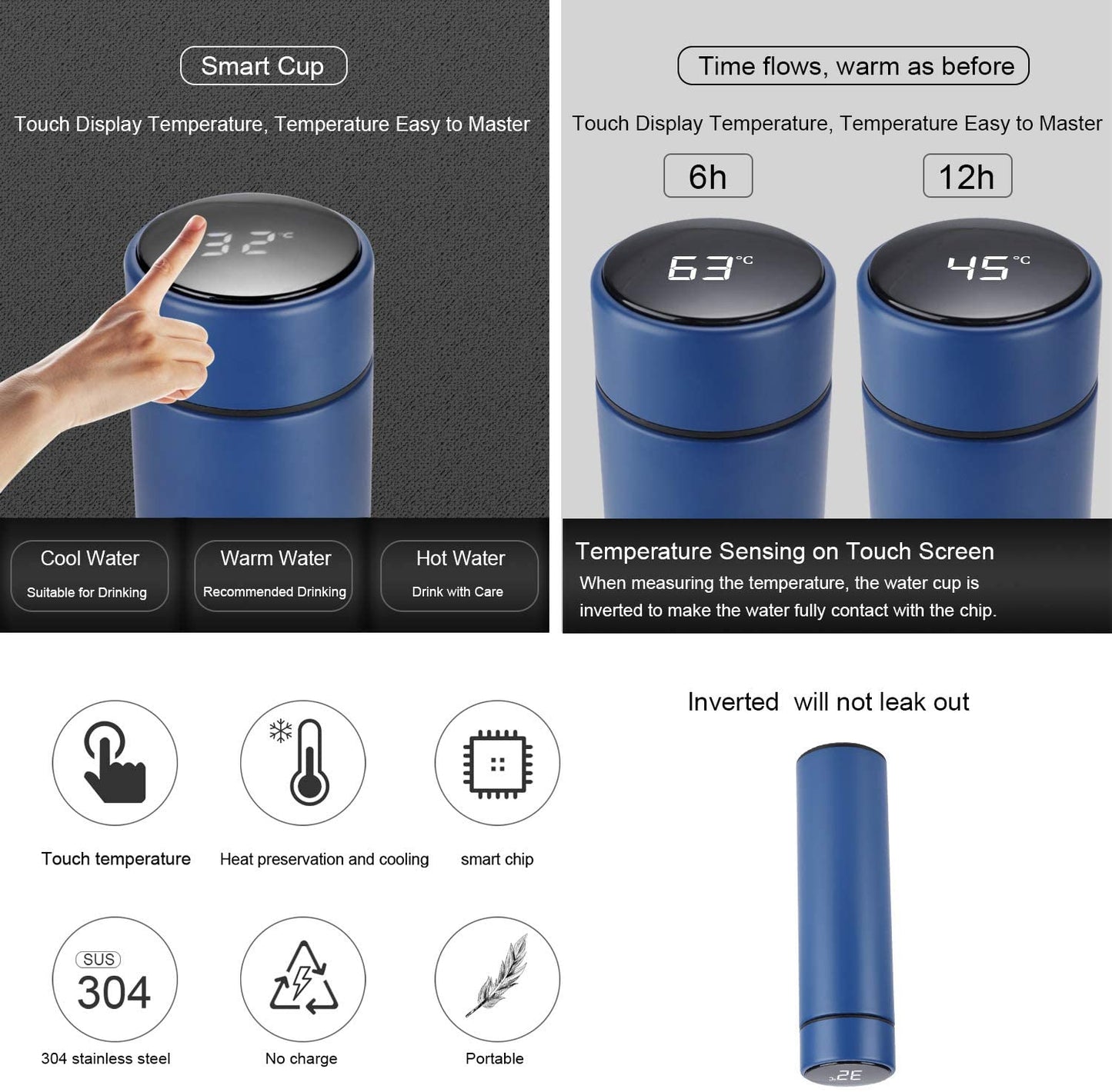- Steel flask is designed to reduce spills and sloshing. The bottl flask is leak proof and safe in the bag while on the go.17oz/500ml water bottle fit in most cupholders and easily fit in a bag to travelPERFECT DESIGN: Intelligent temperature sensor chip is installed inside the cup cover. The inside of the cover is embedded with PP leak-proof silicone ring. The cup mouth is smooth, it will not cut to the lips, the cup has large diameter, easy to clean, detachable filter net, can filter the residue such as tea. The bottom of the cup is made of non-slip material, which is not easy to slip off and is durable.