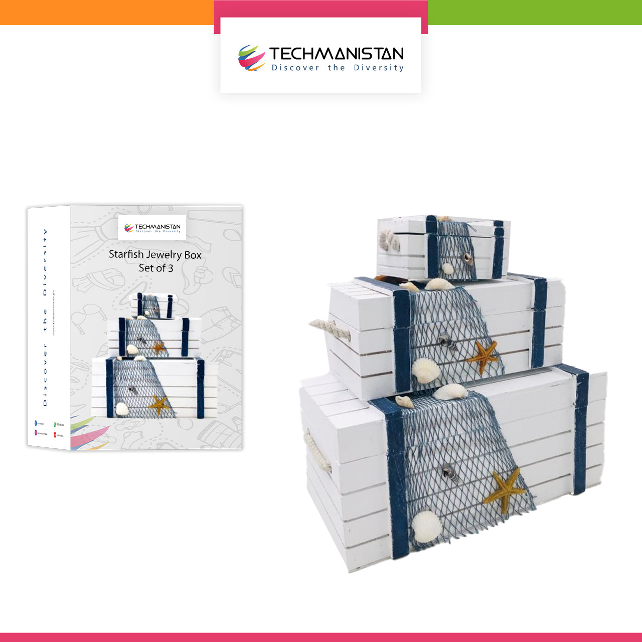 Set of 3 - Multipurposed Starfish Decorations Puzzled Striped Wooden Jewelry Box, Keepsake Organizer or Gift Box